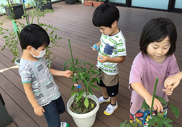 自分たちで育てた野菜でピザ作りをしました。「美味しかった!」「作るの楽しかった!」と大満足な子どもたちでした。